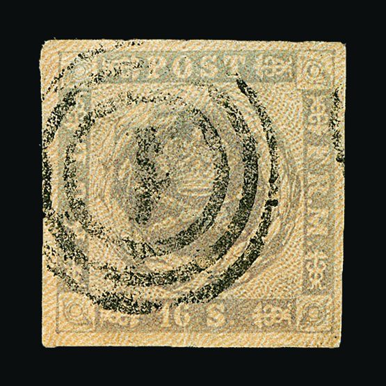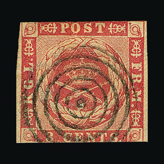 | 4092 | Denmark | more lots in the Gallery | 13 | 1857 16 sk. Grey-Lilac, dotted spandrels, with 4 margins, close to framw at right side. F.u. Concentric-rings cancel. Nice clean example. Cat £225 | £85 |  |