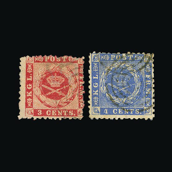 | 4036 | Danish West Indies | more lots in the Gallery | 6-7 | 1872-3 Wmk.Crown, Perf.12½. 3c & 4c both f.u. With concentric-rings cancels. Some uncut perfs at top of 3c, otherwise clean and scarce.(2) Cat £925 US | £356 |  |