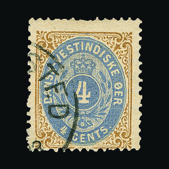 | 4041 | Danish West Indies | more lots in the Gallery | 17 | 1873 (Sept) Defin. Perf.14 x 13½. 4c Blue & Yellow-Brown, neat part c.d.s. Couple of perfs. At top, a little short. Cat £300 US | £80 |  |