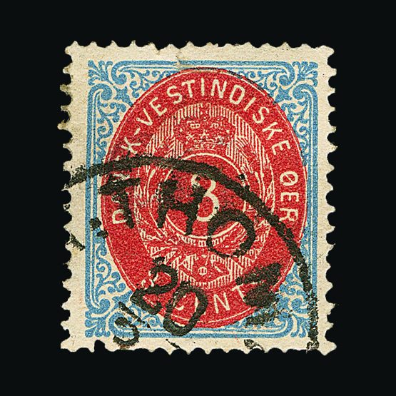 | 4047 | Danish West Indies | more lots in the Gallery | 14a | 1876 (Mar) Defin. FRAME INVERTED. Perf.14 x 13½.3c Carmine & Blue. Neat St.Thomas part c.d.s. Cat £475 US | £178 |  |
