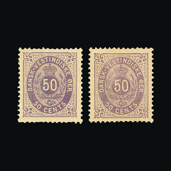 | 4058 | Danish West Indies | more lots in the Gallery | 29-30 | 1879-85 Defins. 50c reddish-Lilac; 50c Slate-Lilac. Both fresh m.m.(2) Cat £550 US | £200 |  |