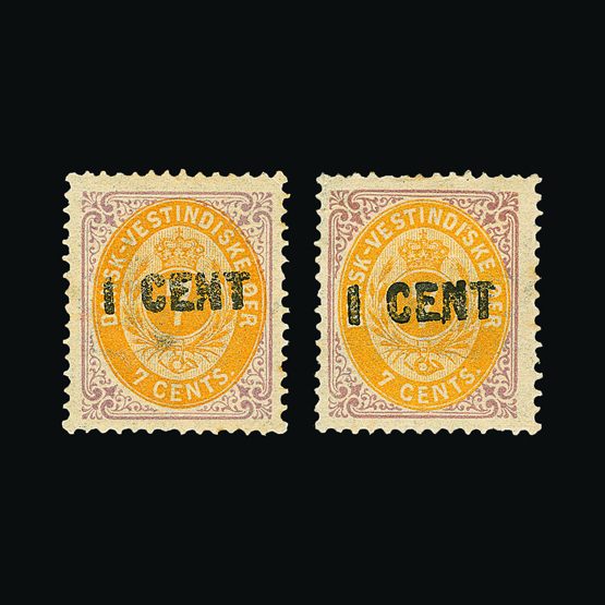 | 4061 | Danish West Indies | more lots in the Gallery | 36-7 | 1887 '1 CENT' on 7c both shades, both FRAME UPRIGHT. Fresh m.m.first stamp is u.m. Few short perfs. On second stamp.(2) Cat £270 US | £76 |  |