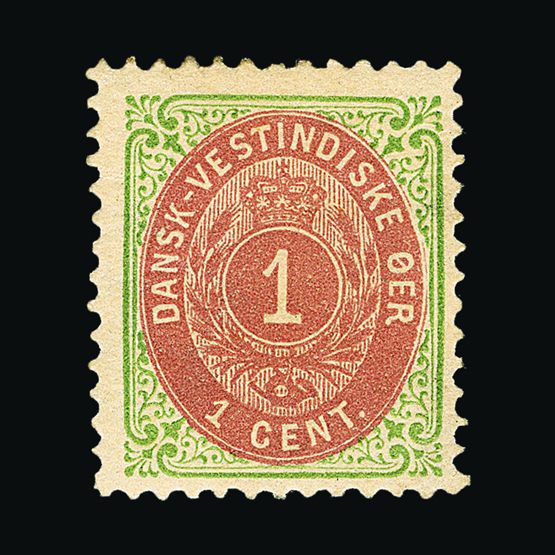 | 4037 | Danish West Indies | more lots in the Gallery | 28 | 1873 Defin. 14c Green & Lilac. Fresh m.m. Slight gum disturbance at top and pencil dealers signature on gum. Rare Cat £1200 US | £400 | |