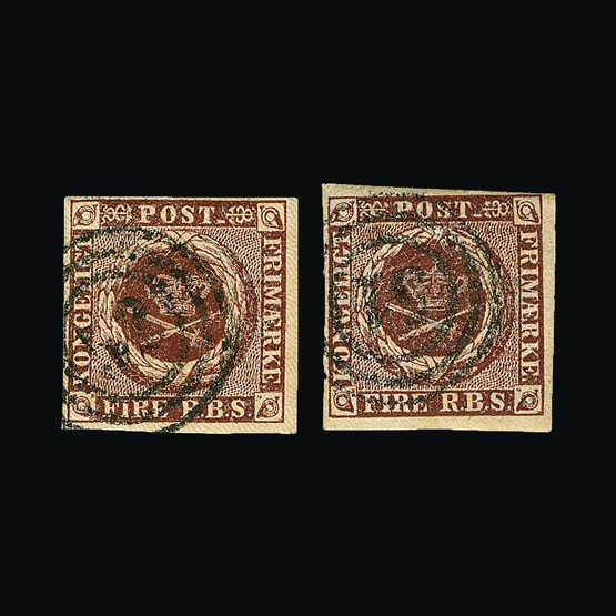| 4088 | Denmark | more lots in the Gallery | 5 x 2 | 1854 (March) 3rd Thiele printing, Wmk.Crown. 4 R.B.S. X 2 being Yellow-Brown & Olive-Brown shades. Both 4 margins. Both f.u. '40' (Logstor) & '24' (Helsingor) concentric-ring cancels. (2) Cat £140 | £60 |  |