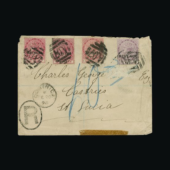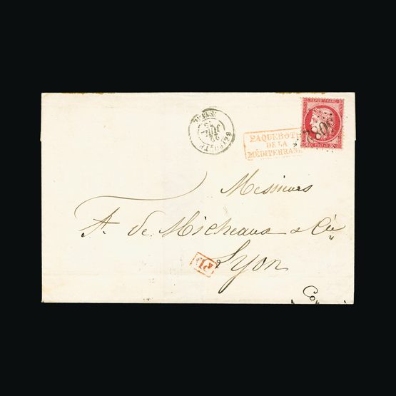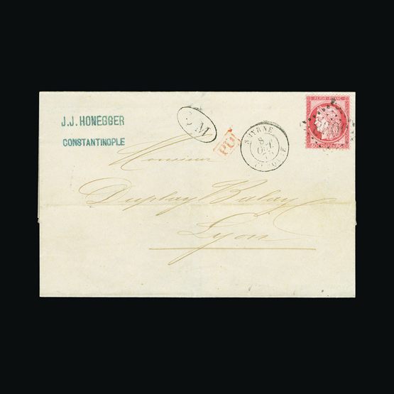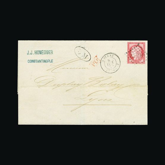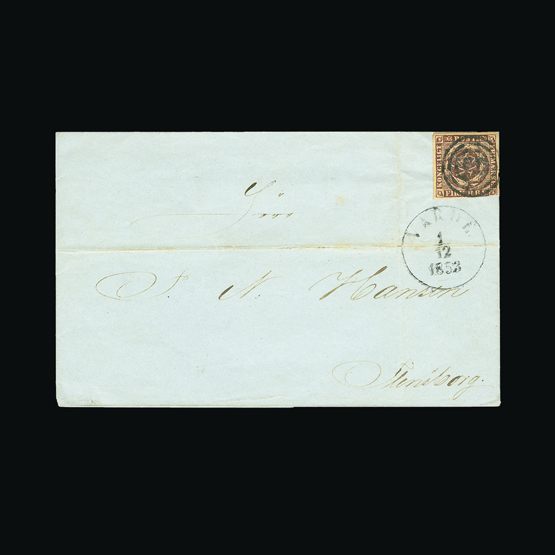 | 4093 | Denmark | more lots in the Gallery | 16 (cover) | 1858 Wavy-lined spandrels, 4 sk. Chestnut, with 4 good margins, on wrapper to Flensburg, with '26' in concentric-rings cancel, and HJORING 24/5/1862 c.d.s. Aalborg transit and receiver on flap. Folds but clean | £25 | |