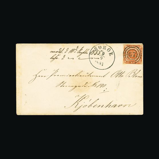 | 4090 | Denmark | more lots in the Gallery | 9a (cover) | 1855 1855 Dotted spandrels, 4 sk.Orange-Brown, 4 margins, on privately-produced envelope with ornate embossed crested flaps. With '67' concentric-rings cancel and SOROE 9/9/1855 c.d.s. To Kjobenhavn. Clean and pretty | £50 |  |