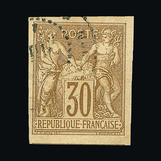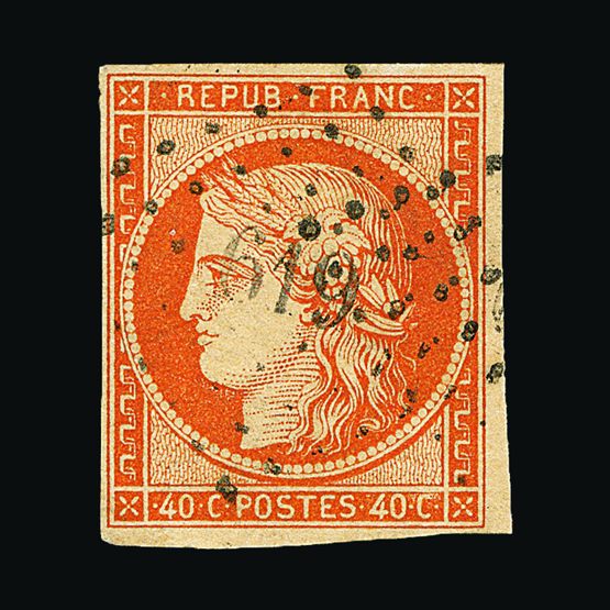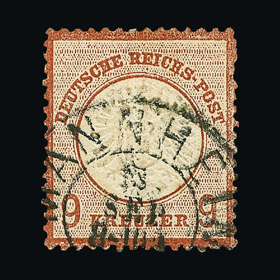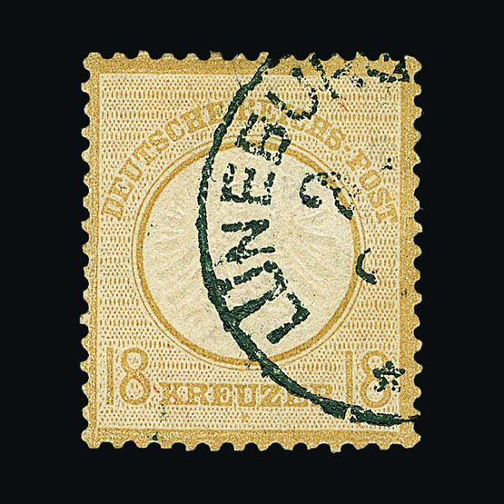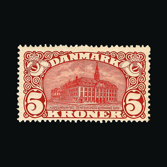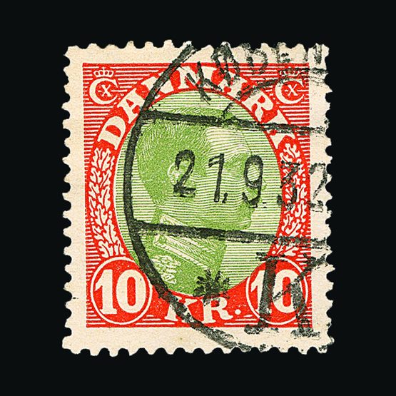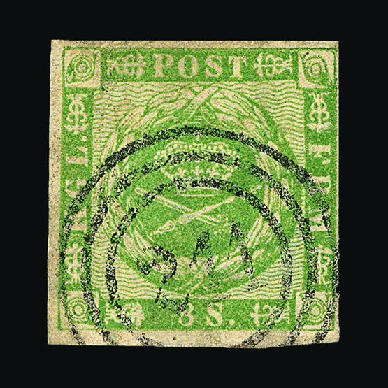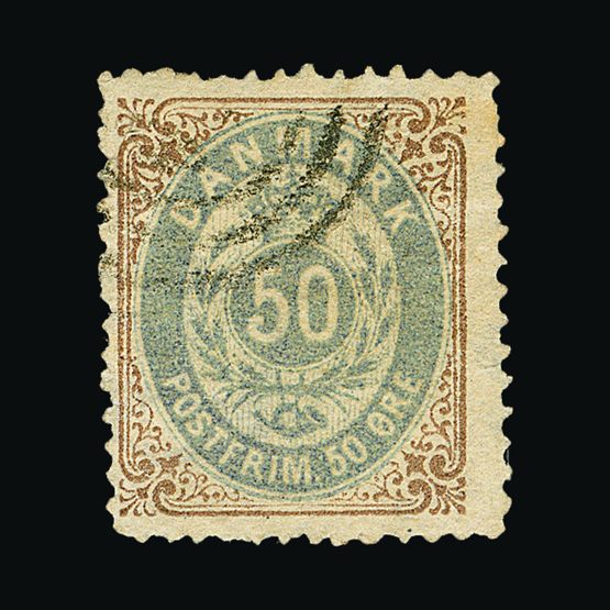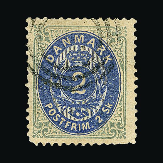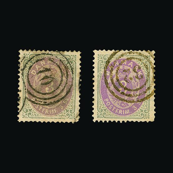 | 4095 | Denmark | more lots in the Gallery | 18 (II) No30 | 1858 Wavy-lined spandrels, 8 sk Green, with 4 margins-close to frame at right. Plate II stamp No 30, showing DOUBLE IMPRESSION OF LOWER-LEFT MERCURY WAND. f.u. '211' in concentric-rings cancels. Scarce and attractive. | £100 |  |