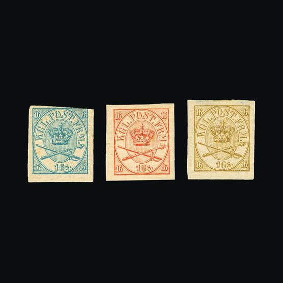 | 4096 | Denmark | more lots in the Gallery | 30 proofs | 1864-70 Crossed Sword & Sceptre, Wmk. Crown, 16 sk TRIAL PRINTS-IMPERF. In Blue, Red, & Brown. With gum (gum thins on 1st and 3rd stamps). Unlisted and estimate is a 'guess' (3 items) | £75 |  |
