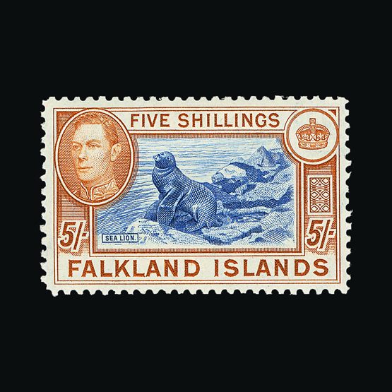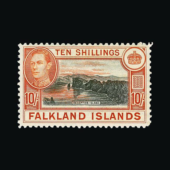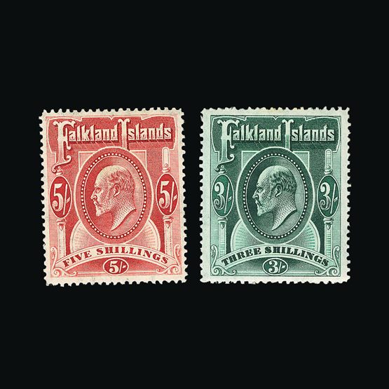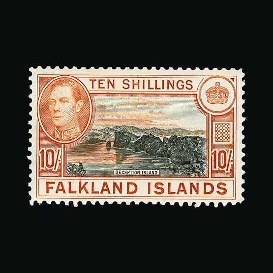 | 7912 | Gibraltar | | | 1938-51 KGVI pictorial issue p.13 5/- (2 shades, one with small hinge on front) plus 10/- value [SG 129b, 130a] fresh mm. (3) Cat £118 | £48 | |
