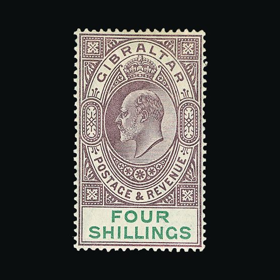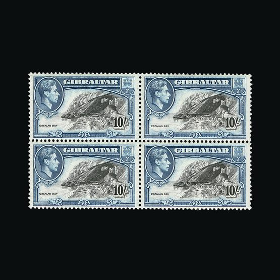 | 7919 | Gibraltar | | 130 | 1938-51 perf 14 10s black and blue, NE corner block of 4, very early printing with sheet number '06', light toning, stamps are u.m. Cat £280 | £120 |  |