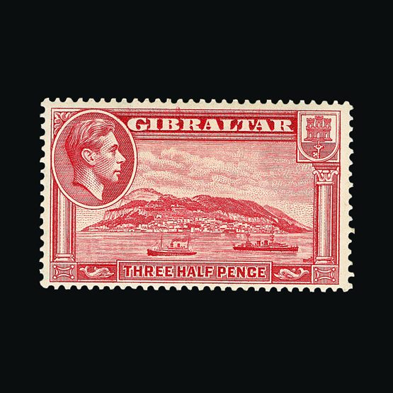 | 7914 | Gibraltar | | 123a | 1938-51 KGVI pictorial p.13½ 1½d carmine (light bend) fresh mm with lightly-toned gum - attractive example of this elusive stamp. Cat £275 | £100 |  |