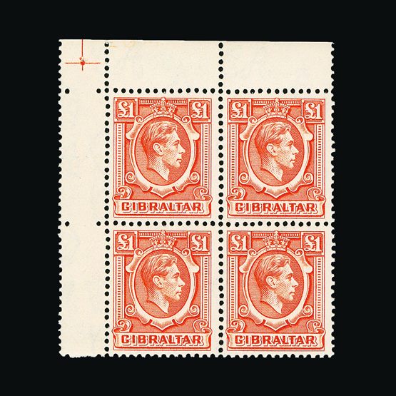 | 7945 | Gibraltar | | 131 | 1938-51 £1 orange, block of 4 from NW corner of right-hand pane, fine and fresh, stamps u.m. Cat £168 | £85 |  |