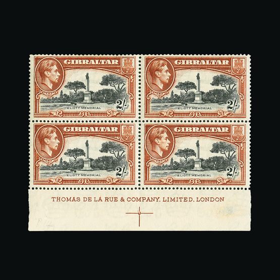 | 7947 | Gibraltar | | 128a | 1938-51 perf 13½ 2s, marginal block of 4, fine and fresh, lightly hinged on one stamp and front of margin only, others u.m. Cat £520 | £240 |  |