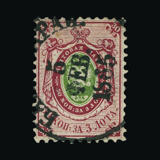 | 18043 | Russia | | 7 | 1858 Eagle 30k Green & Carmine-Rose no wmk P12½ f.u. (Small soiling mark on front). Cat £325 US2 | £116 |  |