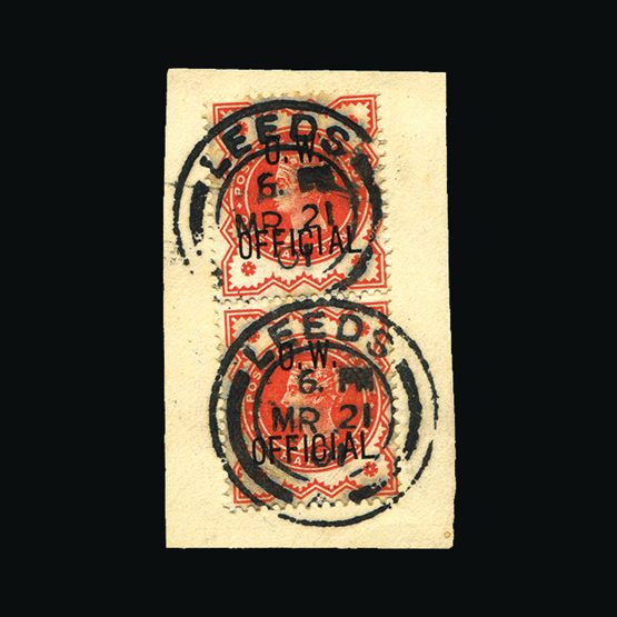 | 8098 | Gilbert and Ellice Islands | | 12-13a | 1912 ½d green and 1d scarlet in horizontal pairs on single piece, each pair tied by full 33mm GILBERT & ELLICE ISLANDS/GPO/TARAINA (?)/ISD/COLONY for MR 25 19 in black, v. fine. US | £32 | |