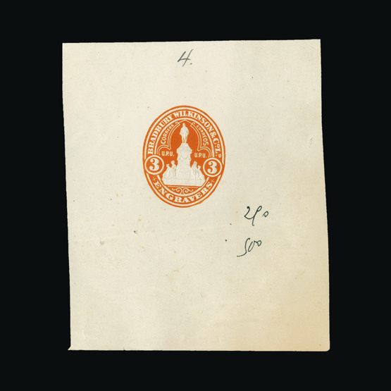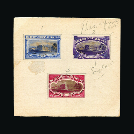 | 1 | General | | | BRADBURY WILKINSON 1911 BW unique hand painted publicity label essays showing the New Malden headquarters, three different designs numbered 1, 2 and 3 affixed to an archive card (125 x 118 mm), with hand painted frames in blue, mauve and red, each with pasted in printed vignette, one with endorsement beneath 'England' to change from Surrey, highly attractive and rare. {E} US5 | £448 |  |