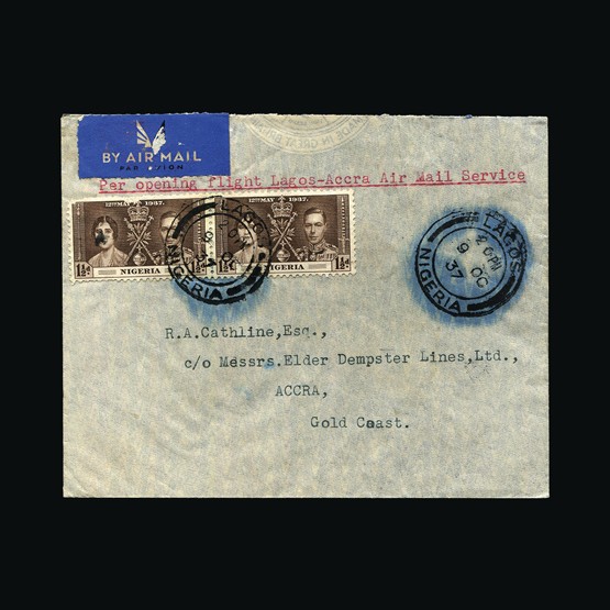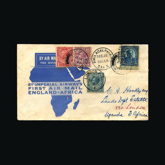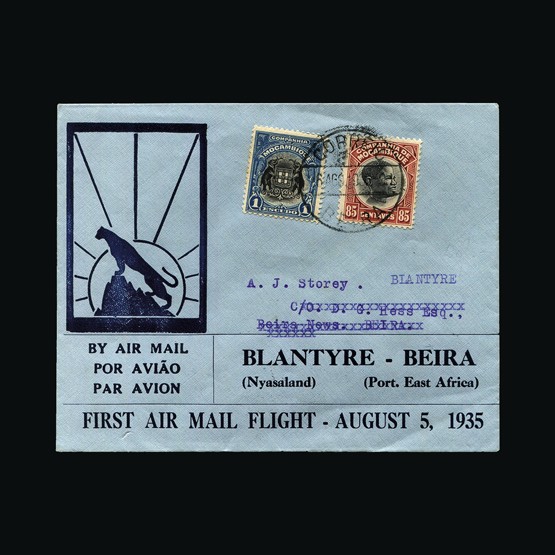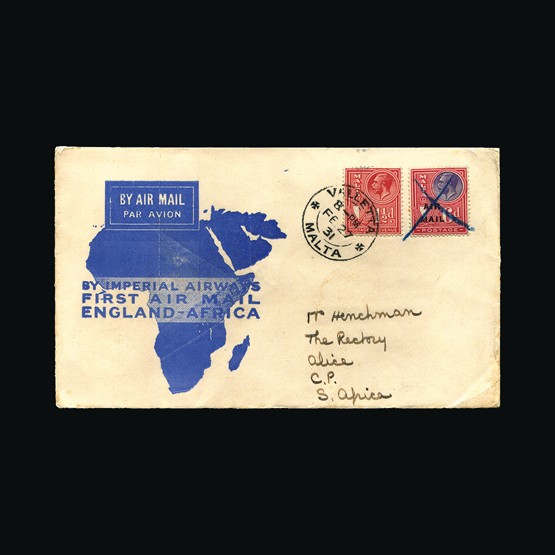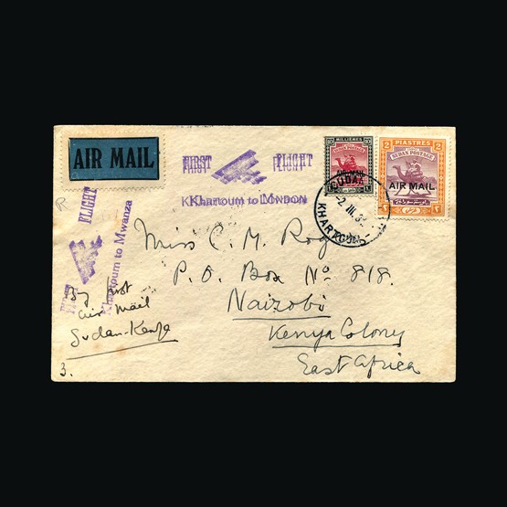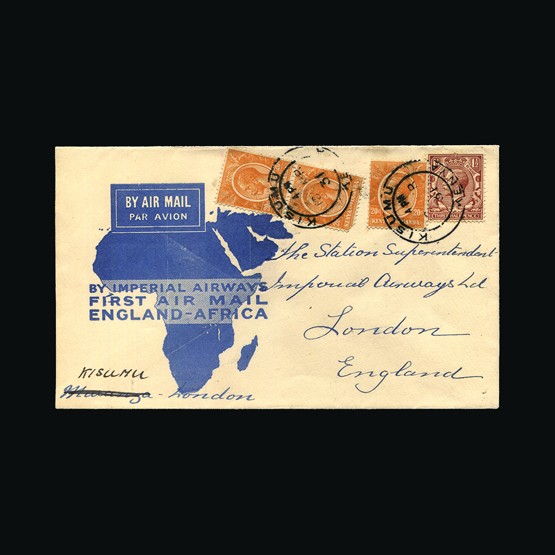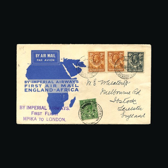 | 65 | General - Imperial Airways | | | CAPE TOWN-LONDON 1ST REGULAR RETURN SERVICE Mpika-London, 2d x 2 & 6d of N Rhodeisa, tied with Mpika 28 Jan 32 cds cancels. On map of Africa illust cover. 'By Imperial Airways First Flight Mpika to London' cachet. Addressed to Leicester. GV ½d tied with Ibstock 17 Feb 32 receiving. Due to be carried on the first Northbound flight AN47 but this was delayed due to emergency landing in a swamp near Broken Hill. A 'Special Flight' was arranged with the City of Baghdad taking mail on the 2 Feb North, Broken Hill, Mpika, Mbeya, Dodoma, Moshi & Nairobi. All mail on this special flight received Nairobi 3 Feb 32 cancels (Except mail destined for UK). No markings on the reverse. Very scarce display quality cover. {C} US2 | £78 |  |