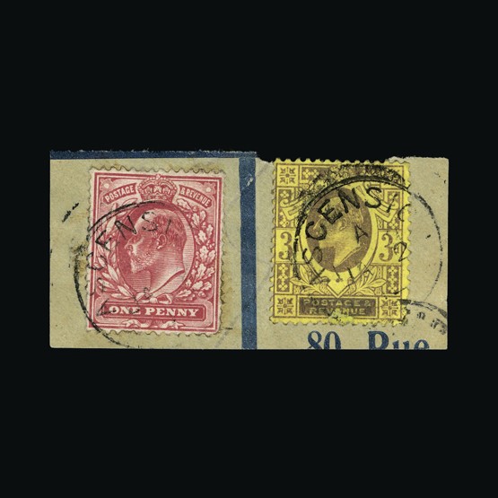 | 3965 | British Honduras | | 17/20 | 1882-87 1d blue, 1d rose and 4d (trimmed perfs at lower left), plus 1d bisected on piece (printed invoice (?) on reverse from v.g.u. AIKMAN), v.g.u. {U} US3 | £29 | |