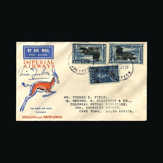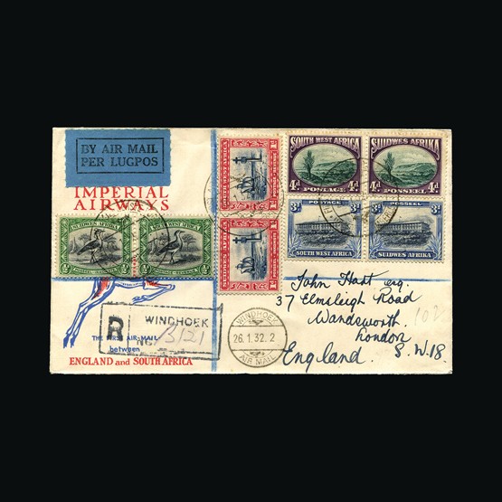 | 89 | General - Imperial Airways | | | CAPE TOWN-LONDON 1ST REGULAR RETURN SERVICE Kimberley-London, ½d 1d 3d & 4d joined pairs of SWA, tied with Air Mail Windhoek-Kimberley 26 Jan 32 cds cancel. On Springbok illust cover. Windhoek 26 1 32 small cds cancel 23mm. Registered Windhoek R cachet with registration number inserted by hand. Addressed to Wandsworth. Feeder service from SWA to Kimberley. On the reverse Windhoek-Kimberley 26 Jan 32 & Wandsworth Registered oval 16 Feb 32 receiving. Very scarce display quality itemSome tone spots around stamps. {C} US2 | £98 |  |