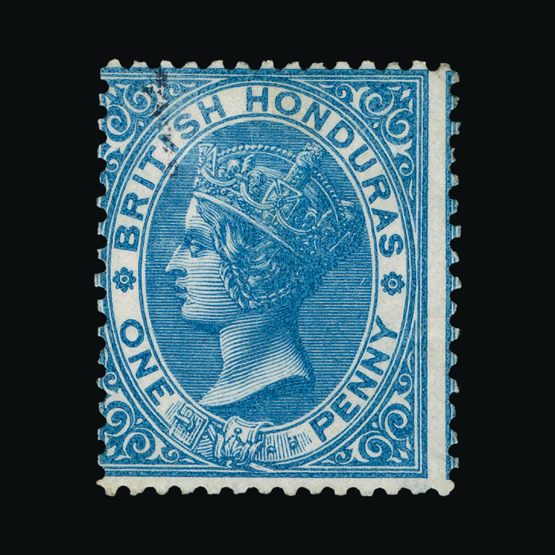 | 3949 | British Honduras | | 2 | 1865 QV - 1d blue, mint, o.g., small h/r. 7mm light black line at NW. Centred NW, frame of adjacent stamp evident at right. Super colour. Cat £100 {MH} US3 | £34 |  |
