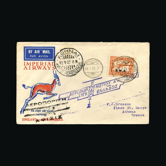 | 43 | General - Imperial Airways | | | CAPE TOWN-LONDON 1ST REGULAR RETURN SERVICE Kimberley-Athens, 1/- Air (SG73) of SWA, tied with Air Mail Windhoek-Kimberley 26 Jan 32 cds cancel. On Robertson illust cover. Windhoek 26 1 32 small cds cancel 23mm. Athens 13 Feb 32 receiving on front with 2 different Greek Air Mail cachets. Addressed to Athens. Feeder service from SWA to Kimberley. No markings on the reverse. {C} US2 | £78 |  |