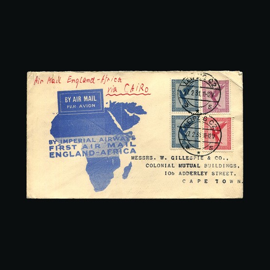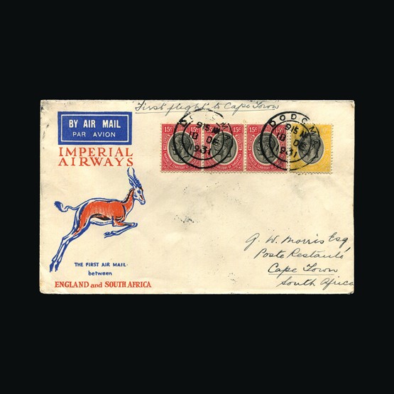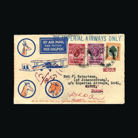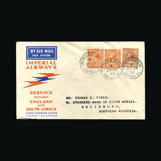 | 71 | General - Imperial Airways | | | CAPE TOWN-LONDON 1ST REGULAR RETURN SERVICE Salisbury-London, 1d x 2, 4d & 6d of S Rhodesia, tied with Salisbury 28 Jan 32 cds cancels. On Rhodes souvenir First Official Flight illust cover. First Official Air Mail cachet. Addressed to Sir William Noble Leamington. No markings on the reverse. Folded twice vertically clear of stamps. {C} US2 | £62 | |