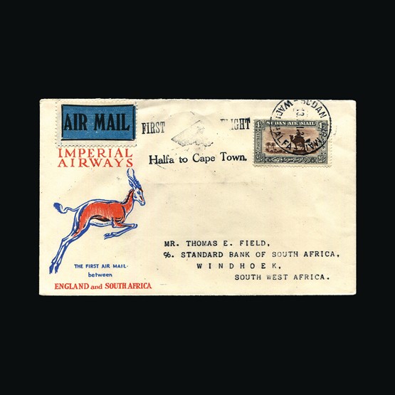 | 76 | General - Imperial Airways | | | CAPE TOWN-LONDON 1ST REGULAR RETURN SERVICE Cape Town-Khartoum, 2d & 6d of South Africa, tied with Cape Town 27 Jan 32 cds cancel. On Springbok illust cover. Sudan Air Mail Khartoum 10 Feb 32 on front. Addressed to Sinkat. On the reverse Sinkat 12 Feb 32 receiving. Nice clean cover. {C} US2 | £39 | |