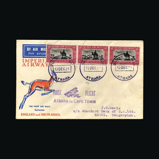 | 52 | General - Imperial Airways | | | CAPE TOWN-LONDON 1ST REGULAR RETURN SERVICE Pietersburg-Khartoum,1d joined vert pair & 1½d tete-bache block of 4 (SG5a) of South Africa, tied with Pietersburg 28 Jan 32 cds cancels. On Robertson illust cover. Addressed to Khartoum. On the reverse Salisbury 28 Jan 32 transit, Sudan Air Mail Khartoum 10 Feb 32 receiving. Most unusual usage. {C} US2 | £78 |  |