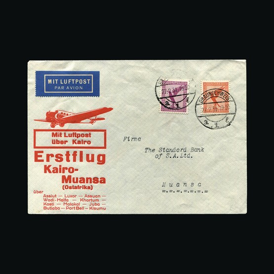 | 67 | General - Imperial Airways | | | CAPE TOWN-LONDON 1ST REGULAR RETURN SERVICE Broken Hill-London, 4d & 6d of N Rhodeisa, tied with Broken Hill 29 Jan 32 cds cancels. On Springbok illust cover. Addressed to Anglesey with Tynygongl 17 Feb 32 receiving on the front. Due to be carried on the first Northbound flight AN47 but this was delayed due to emergency landing in a swamp near Broken Hill. A 'Special Flight' was arranged with the City of Baghdad taking mail on the 2 Feb North, Broken Hill, Mpika, Mbeya, Dodoma, Moshi & Nairobi. All mail on this special flight received Nairobi 3 Feb 32 cancels (Except mail destined for UK). No markings on the reverse. Very scarce clean cover. {C} US2 | £59 | |