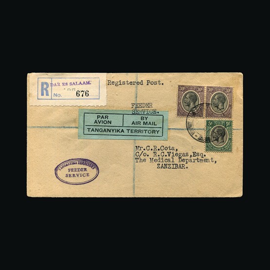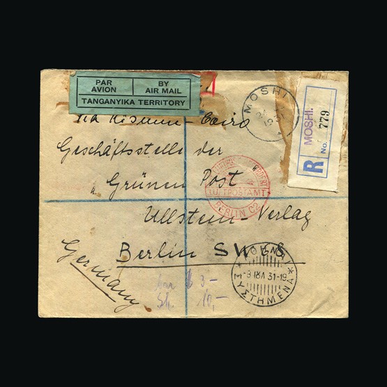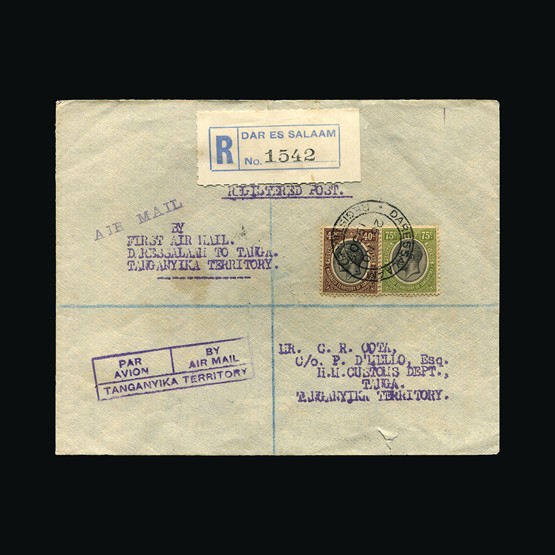 | 53 | General - Imperial Airways | | | CAPE TOWN-LONDON 1ST REGULAR RETURN SERVICE Pietersburg-Dodoma, 4d Air joined pair & 2d of South Africa, tied with Pietersburg 28 Jan 32 cds cancel. On plain Registered cover. Air Mail label middle left. Pietersburg registered R cachet with registration number inserted by hand. Typed 'By first Air Mail Pietersburg-Dodoma. Addressed to Dodoma. On the reverse Pietersburg 28 Jan 32, Salisbury Registered 28 Jan 32 transit, Mbeya 6 Feb 32 transit, Dodoma 7 Feb 32 receiving. Daressalaam 20 Feb 32 registered for the return to sender. Some tone spots. {C} US2 | £32 | |