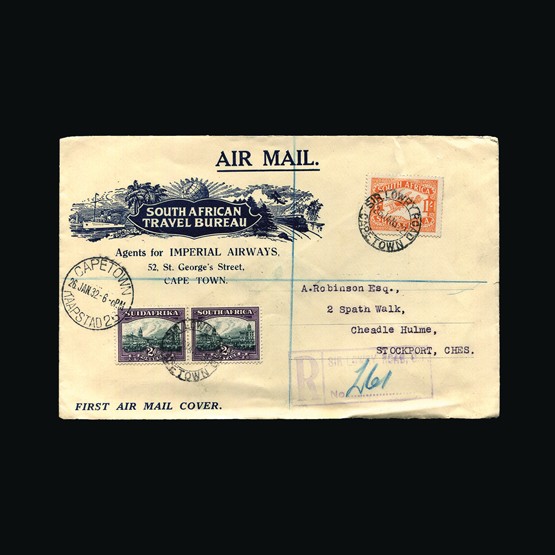 | 79 | General - Imperial Airways | | | CAPE TOWN-LONDON 1ST REGULAR RETURN SERVICE Cape Town-London, 1/- Air & 2d joined pair (SG44) of South Africa, tied with Sir Lowry Road Cape Town 26 Jan 32 cds cancels. On South African Travel Bureau illust cover. Cape Town 26 Jan 32 cds. Registered with Sir Lowry Road R cachet & manuscript registration number inserted. Addressed to Stockport. On the reverse Sir Lowry Road 26 Jan 32 despatch. Stockport registered oval 17 Feb 32. Some minor edge wear on very scarce display quality cover. {C} US2 | £118 |  |