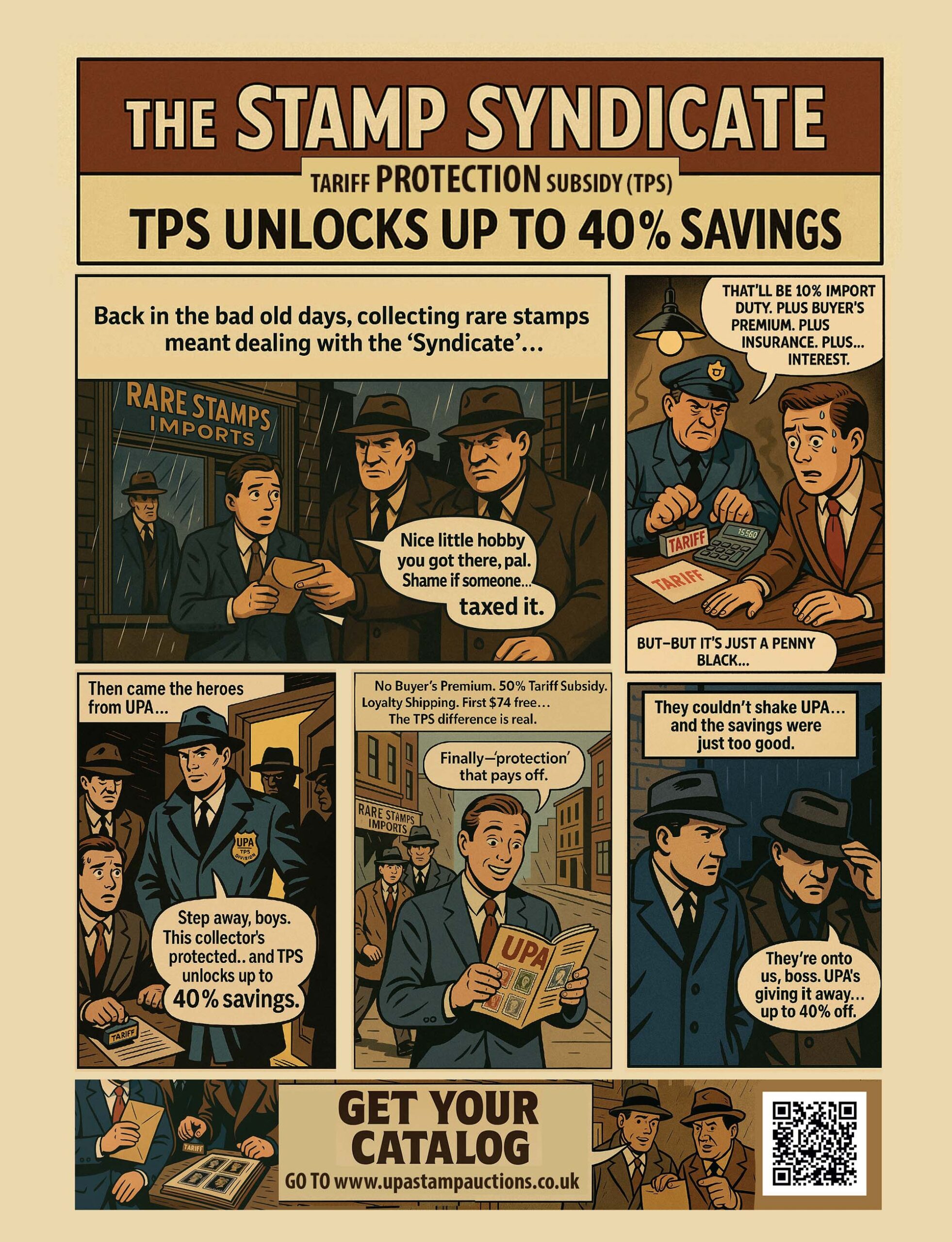 Admittedly, we have presented UPA’s TPS – Tariff Protection Subsidy, in an engaging ‘US inspired’ cartoon advertisement … but the point is (and it all comes back to money), all auctions, even eBay exports from the UK to successful overseas bidders are increasingly being charged by their Government (Post Office representative) import TAX (tariff) upon delivery.